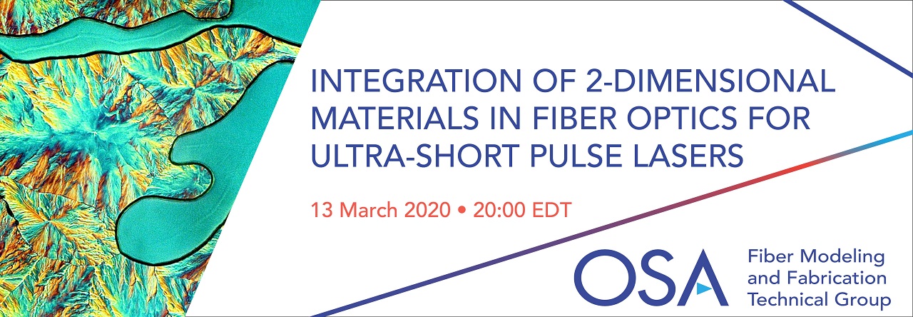 In this webinar hosted by the OSA Fiber Modeling and Fabrication Technical Group, Dr. Kyunghwan Oh of Yonsei University will discuss the current status of nonlinear optic studies of 2-dimensional materials such as graphene, transition metal dichalcogenides, and perovskites. Basic physical principles for nonlinear saturable absorption will be discussed and various structures for implementing those 2-dimensional materials in fiber optic platforms will be reviewed. Finally, fiber laser cavities with these novel saturable absorbers will be discussed in terms of pulse duration, spectral width, and average power. The webinar will be a good review for graduate students to pursue combination of fiber optics with new materials.