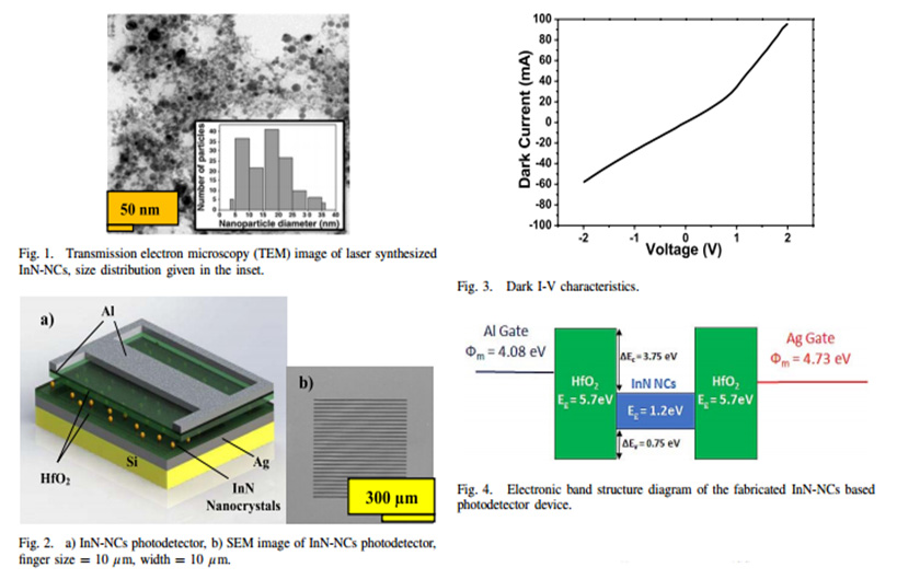 We present a proof-of-concept photodetector that is sensitive in the near-infrared (NIR) range based on InN nanocrystals. Indium nitride nanocrystals (InN-NCs) are obtained through laser ablation of a high pressure chemical vapor deposition grown indium nitride thin film and are used as optically active absorption region. InN-NCs are sandwiched between thin insulating films to reduce the electrical leakage current. Under −1 V applied bias, the recorded photoresponsivity values within 600–1100-nm wavelength range are as high as 3.05 × 10−2 mA/W. An ultrathin layer of nanocrystalline InN thin film is, therefore, a promising candidate for NIR detection in large area schemes.