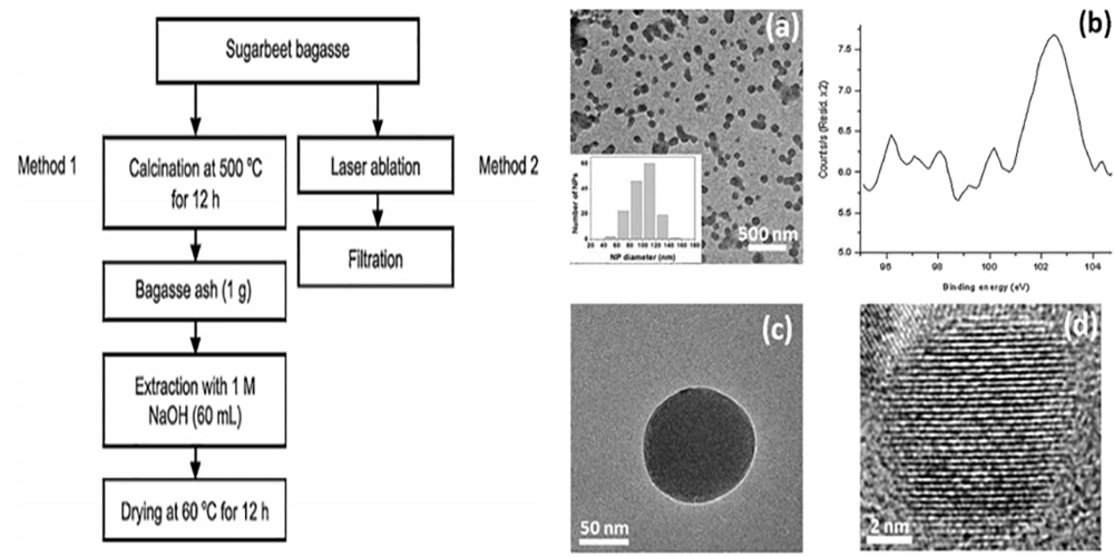 Scientific research involving nanotechnology has grown exponentially and has led to the development of engineered nanoparticles (NPs). Silica NPs have been used in numerous scientific and technological applications over the past decade, necessitating the development of efficient methods for their synthesis. Recent studies have explored the potential of laser ablation as a convenient way to prepare metal and oxide NPs. Due to its high silica content, low cost, and widespread availability, sugarbeet bagasse is highly suitable as a raw material for producing silica NPs via laser ablation. In this study, two different NP production methods were investigated: laser ablation and NaOH treatment. We developed a novel, one-step method to produce silica NPs from sugarbeet bagasse using laser ablation, and we characterized the silica NPs using environmental scanning electron microscopy (ESEM), energy dispersive spectrometry (EDS), dynamic light scattering (DLS), transmission electron microscopy (TEM), attenuated total reflectance-Fourier transform infrared spectroscopy (ATR–FTIR), X-ray photoelectron spectroscopy (XPS) and Raman spectroscopy. EDS analysis and XPS confirmed the presence of silica NPs. The NPs produced by laser ablation were smaller (38–190 nm) than those produced by NaOH treatment (531–825 nm). Finally, we demonstrated positive effects of silica NPs produced from laser ablation on the growth of microalgae, and thus, our novel method may be beneficial as an environmentally friendly procedure to produce NPs.