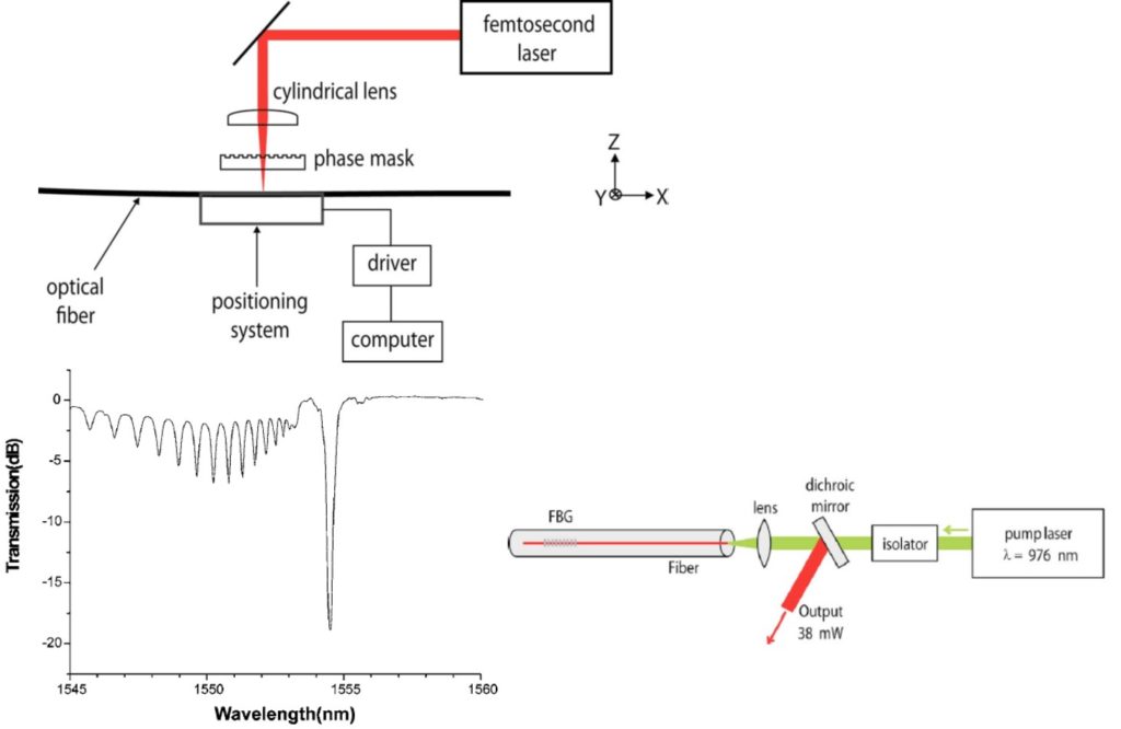 The experimental setup for the FBG inscription is shown in Figure. The fiber used for our experiments is an aluminosilicate Er-doped fiber (Liekki Er80-8/150) free from Ge or any other photosensible dopants. The femtosecond laser beam is focused into the core of the single-mode Er-doped fiber by a cylindrical lens f = 40 mm to get enough peak intensity for the refractive index change. The calculated focused beam width of 8.5 μm is comparable with the 8 μm of the core diameter. To get sufficient grating reflectivity, we translated both the phase mask and the fiber with a constant velocity of 4 mm/min by using a high-precision translation stage. Hence a grating having a length of 40 mm was inscribed with a pulse energy of 600 μJ. The grating reflectivity R 98.7% was deduced from the trans- mission loss.