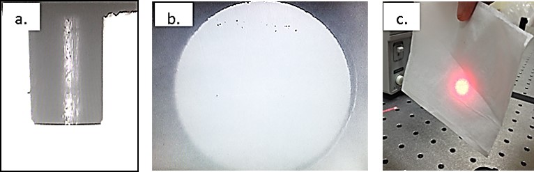 Fig.8: Zemax simulation of the conical tip fiber at non-sequential mode. a) Fiber geometry and light deflection from the tip. b) The radial emission from thefiber tip and c) the light deflection shape from the conical tip fiber at the semi-spherical detector.