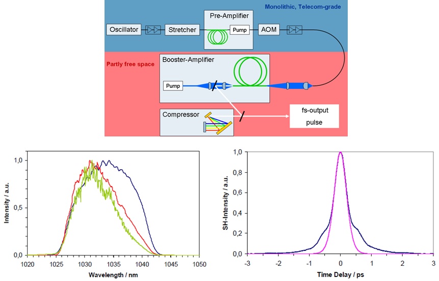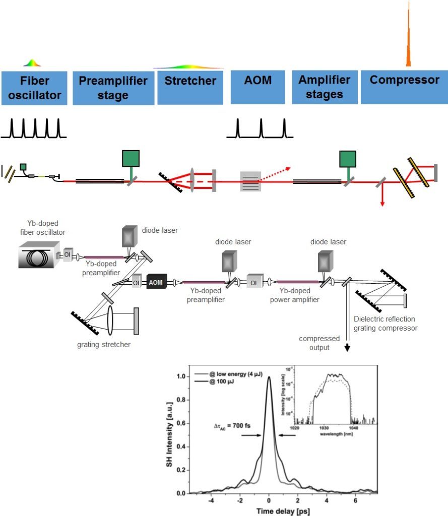We have developed a femtosecond fiber laser for medical applications. The laser generates > 5 μJ-pulses at an ultra -short pulse duration of < 400 fs and a pulse repetition rate of 200 kHz. The average power of the laser is ~ 1 W and the pulse repetition rate can be scaled to > 1 MHz. The laser system is compact and is dimensioned for air-cooled operation. For high stability the laser is monolithically integrated from the oscillator to the booster amplifier stage relying mostly on qualified and economic Telecom-grade polarization maintaining components. For simplicity and flexibility reasons we chose a modular setup of the femtosecond fiber laser source. The principal laser set-up consists of the six modules oscillator, pulse stretcher, pre-amplifier, acousto-optic pulse picker, booster amplifier, and pulse compressor, and is shown in Figure.
